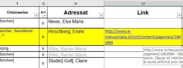 Peter Oberthür hat eine neue Fassung der Rilke-Briefkonkordanz fertiggestellt. Diese Version enthält 309 gegenüber der Vorgängerversion (2017) neu aufgenommene Briefe von oder an Rilke. Dazu kommen weitere Ergänzungen zu den Fundorten und den Quellen, weitere Briefpartner und kleinere Korrekturen bei den Datums- und/oder Ortsangaben. Neu: In einer zusätzlichen Spalte „LINK“ finden Sie ca. 600 Hyperlinks zu Originalbriefen im Internet, die meisten davon bei e-manuscripta.ch, der Plattform für digitalisierte handschriftliche Quellen aus Schweizer Bibliotheken und Archiven.